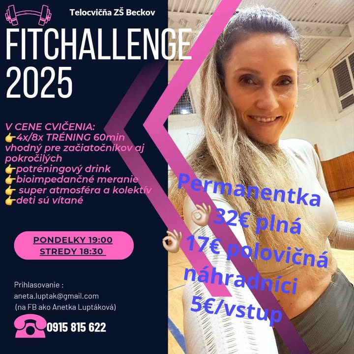 Príď si s nami zacvičiť každý pondelok o 19.00 hod a každú stredu o 18:30 hod do telocvične ZŠ Beckov.