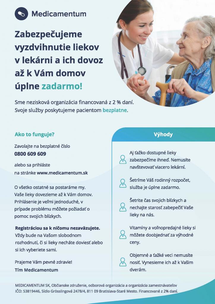V prípade záujmu o bezplatný dovoz liekov pre Vás alebo Vášho rodinného príslušníka kontaktujte bezplatnú linku 0800 609 609 alebo sa zaregistrujte na webovej stránke www.medicamentum.sk.