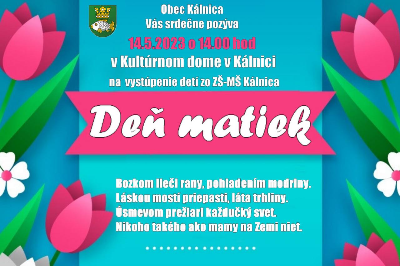 Vážení občania. Obec Kálnica Vás srdečne pozýva dňa 14.5.2023 o 14.00 hod. na vystúpenie detí zo ZŠ-MŠ Kálnica ku dňu matiek. Tešíme sa na Vašu účasť...