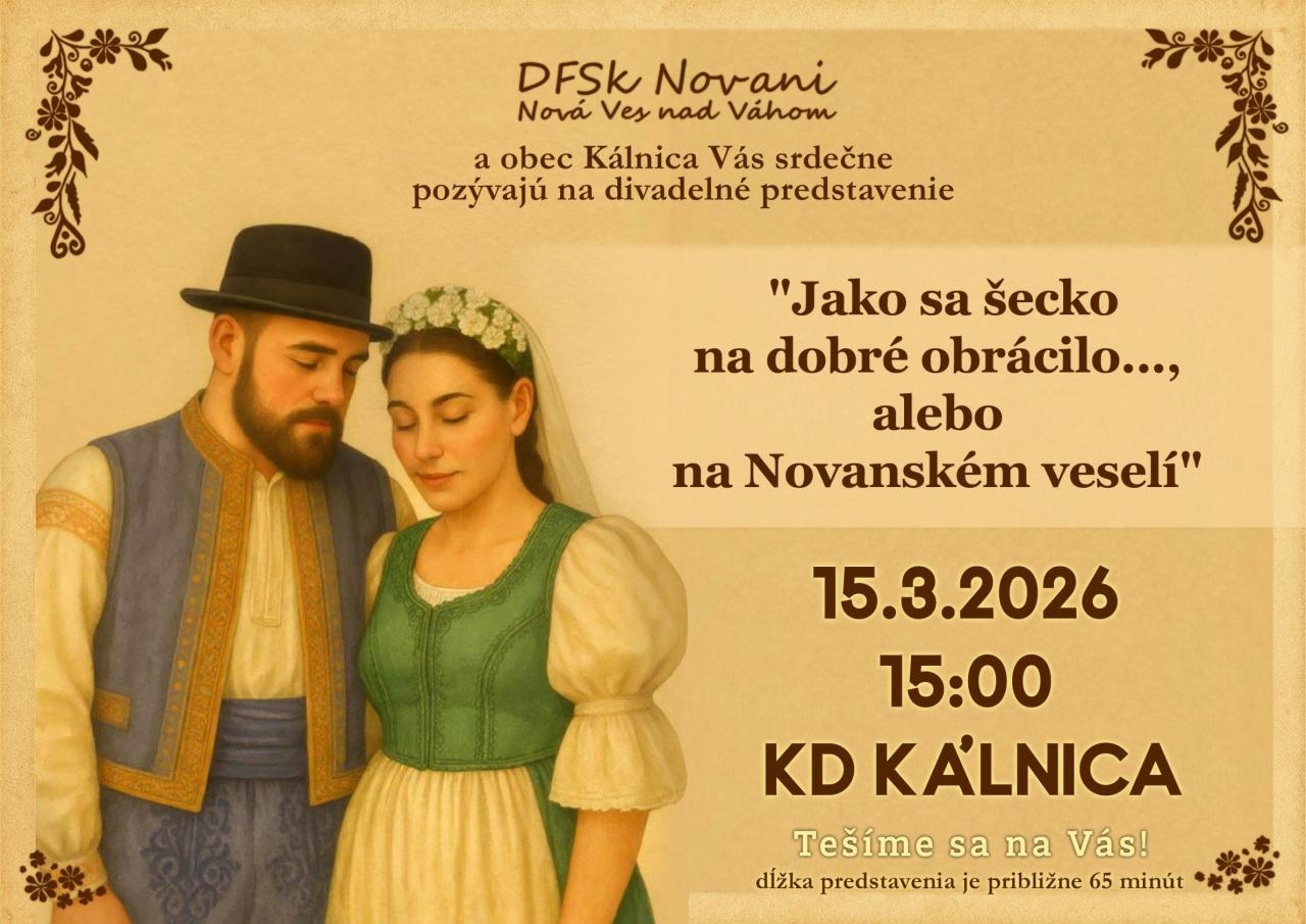 Srdečne všetkých pozývame na naše autorské divadelné predstavenie: "Jako sa šecko na dobré obrácilo..., alebo na Novanském veselí", ktoré sa uskutoční v Kultúrnom dome v Kálnici dňa 15.3.2026 (nedeľa) o 15:00 hod.